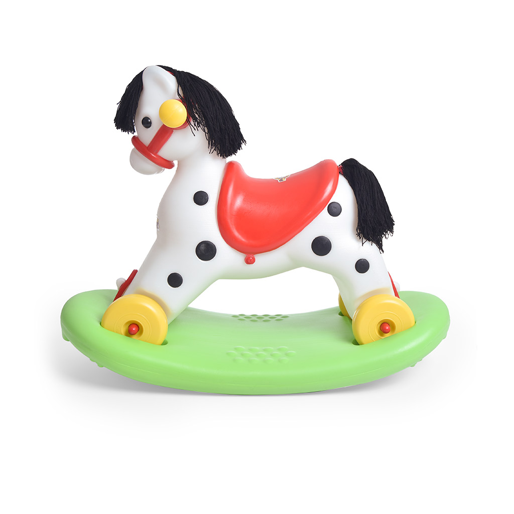 Cheval Basculant 2 en 1 charmant de couleur blanche avec des taches en noir. Dimensions : 70*30*53 cm (L*l*h) Age : 12mois et + Matière : plastique